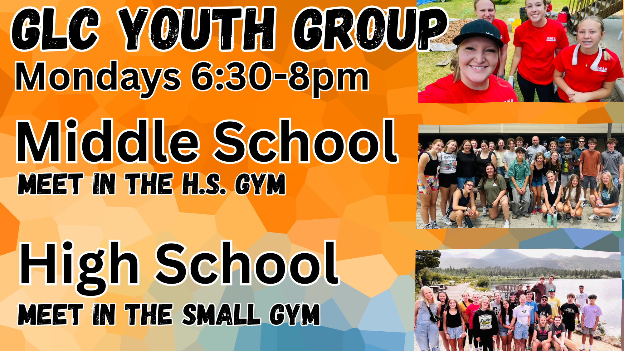 High School Youth meet and Middle School Youth meet from 6:30-8pm on Monday nights.